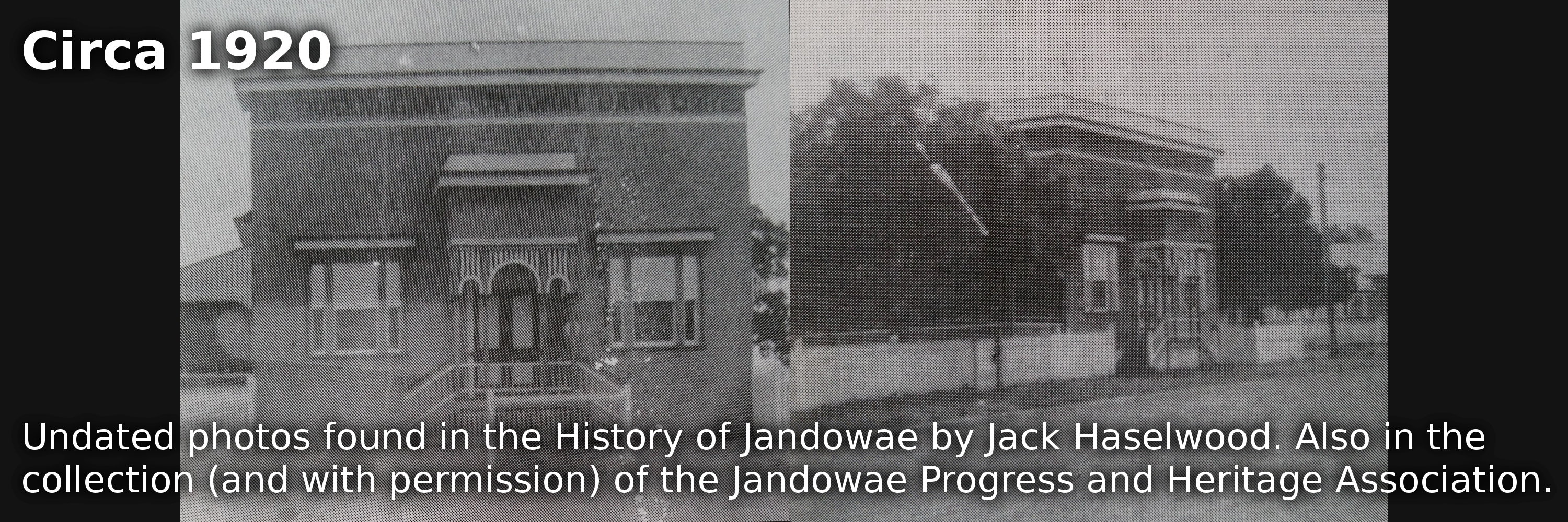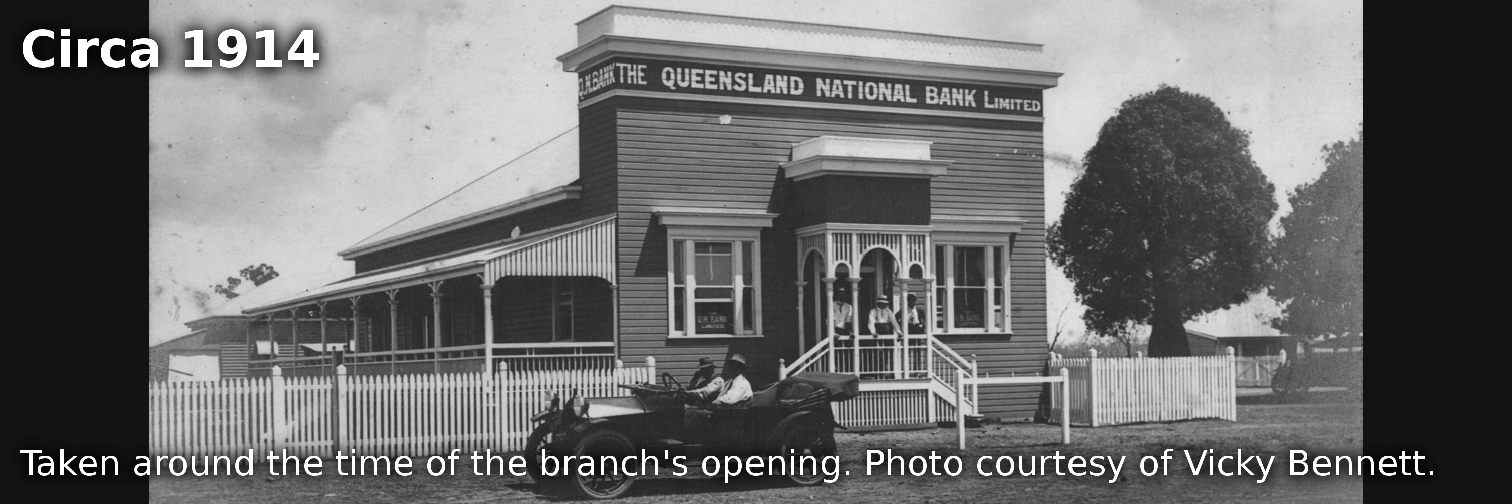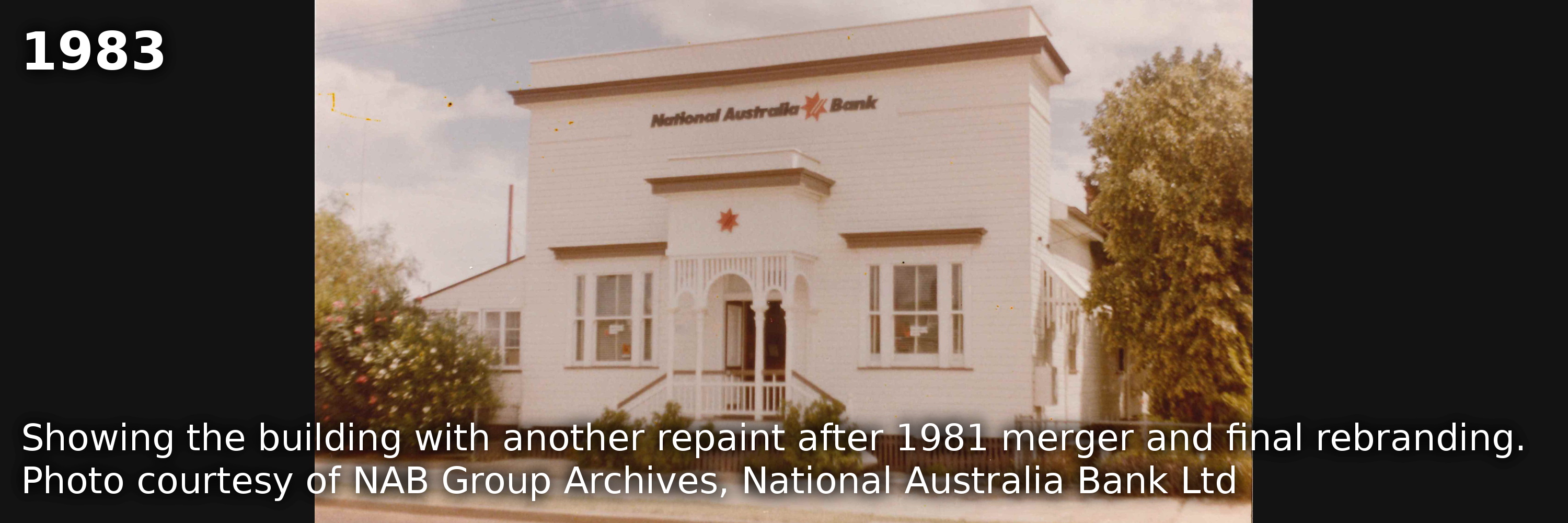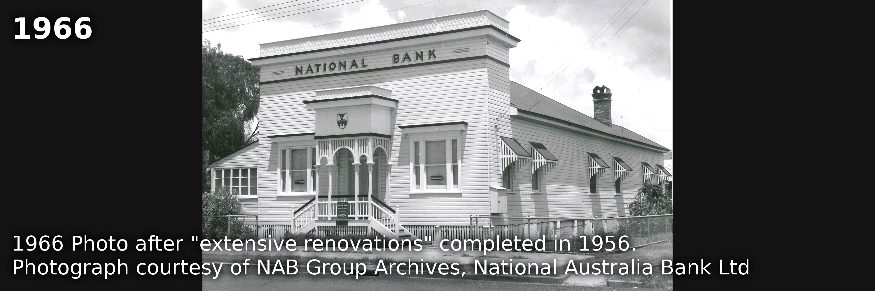 In 1948 the Queensland National Bank Limited merged with the National Bank of Australasia Limited. Following another merger with the Commercial Banking Company of Sydney in 1981 it became renamed the National Australia Bank and remained such until the branch’s closure in late 1996 at which time it became a private residence.